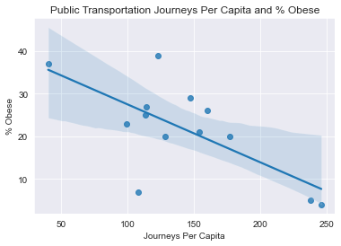 This graph shows number of public transportation journeys per capita on the X-axis and obesity rate on the Y-axis. On this graph, observe the downward sloping regression line indicating an inverse relationship between obesity and public transportation use. These data were sourced from the UTIP and the World Bank. See below:
